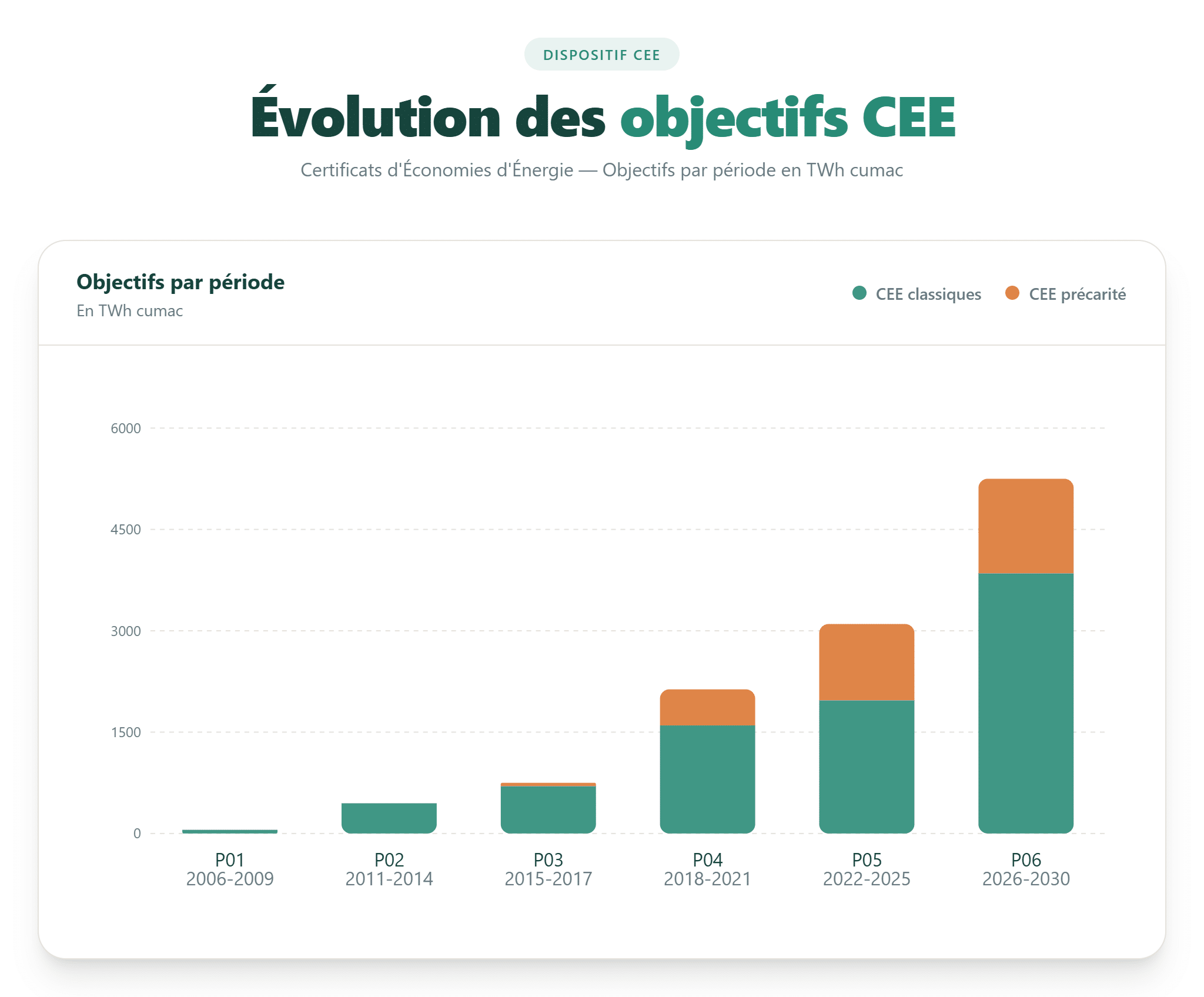 La sixième période des CEE (2026-2030) renforce fortement les objectifs d’économies d’énergie. Elle vise à accélérer la transition énergétique, avec un accent accru sur la rénovation et la lutte contre la précarité. Les exigences de qualité, de contrôle et de performance seront également renforcées pour garantir des résultats durables.